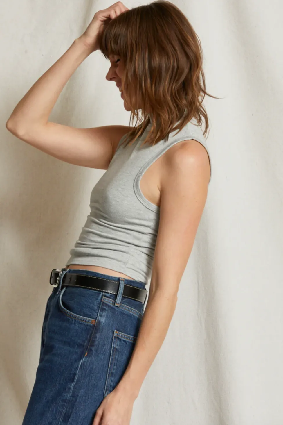 Rib sleeveless mock neck tank.