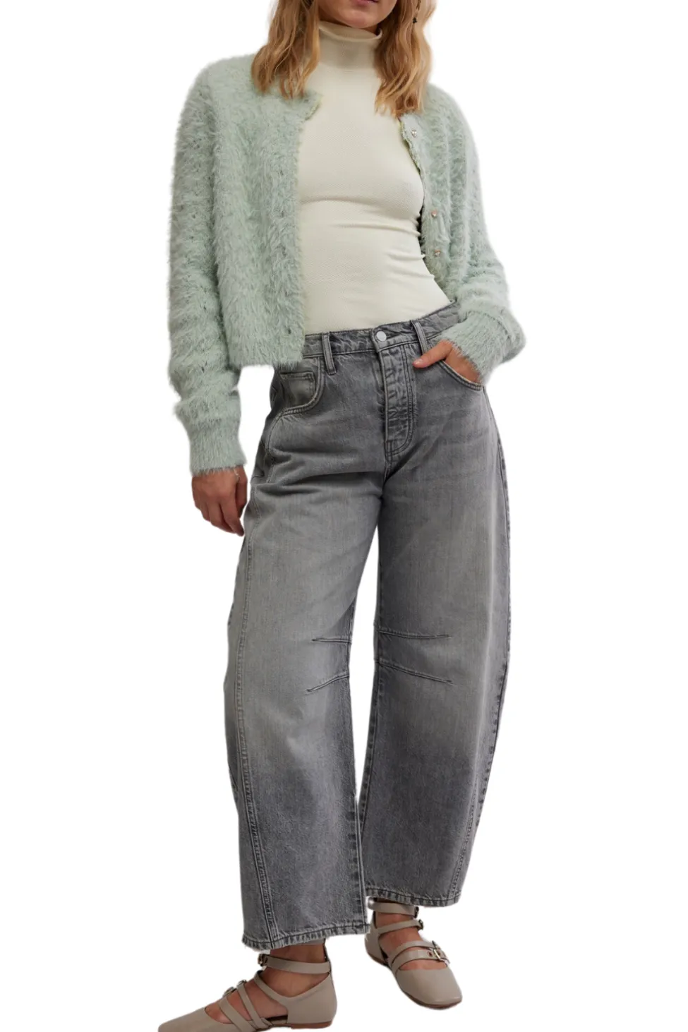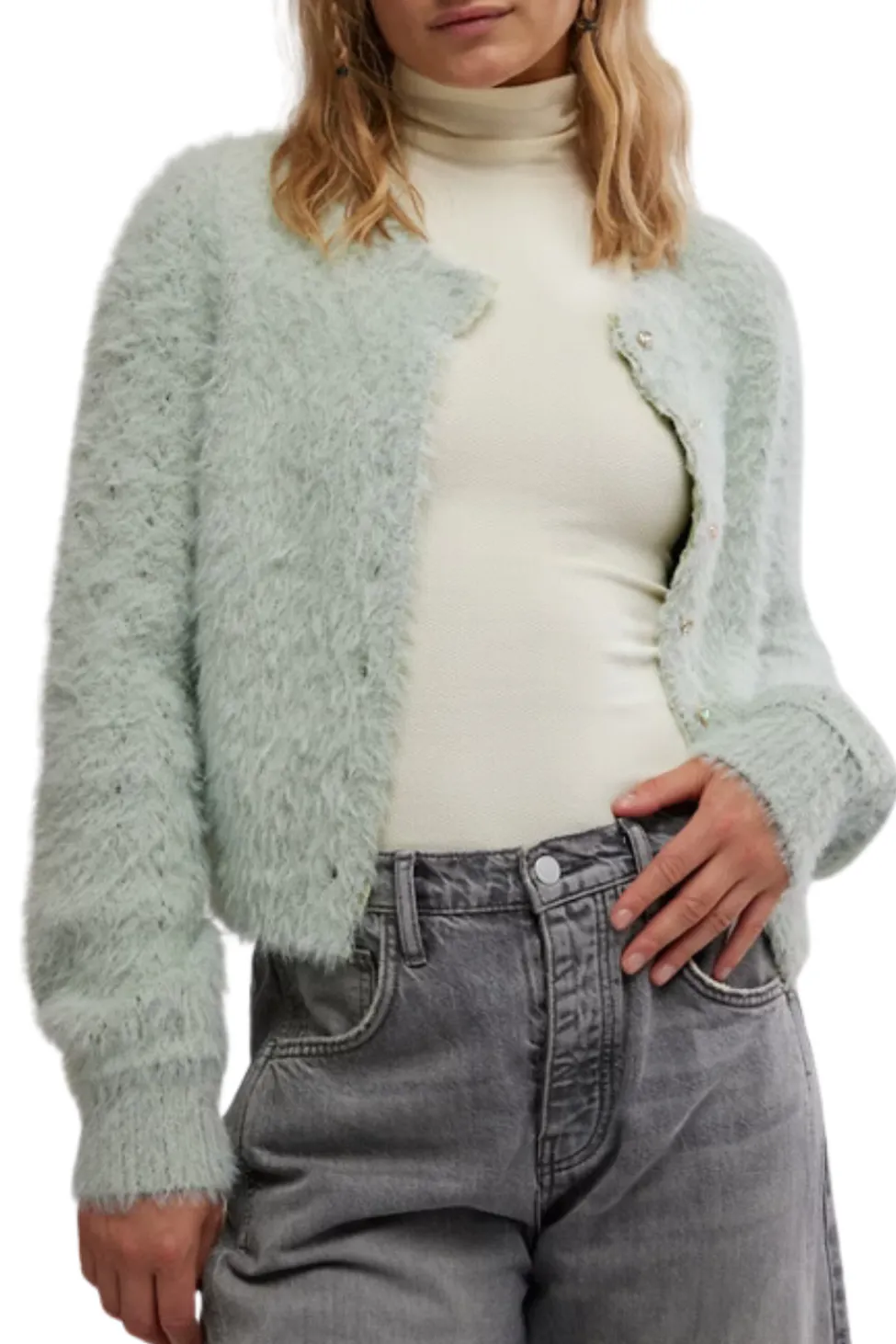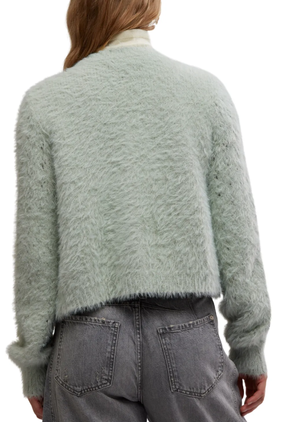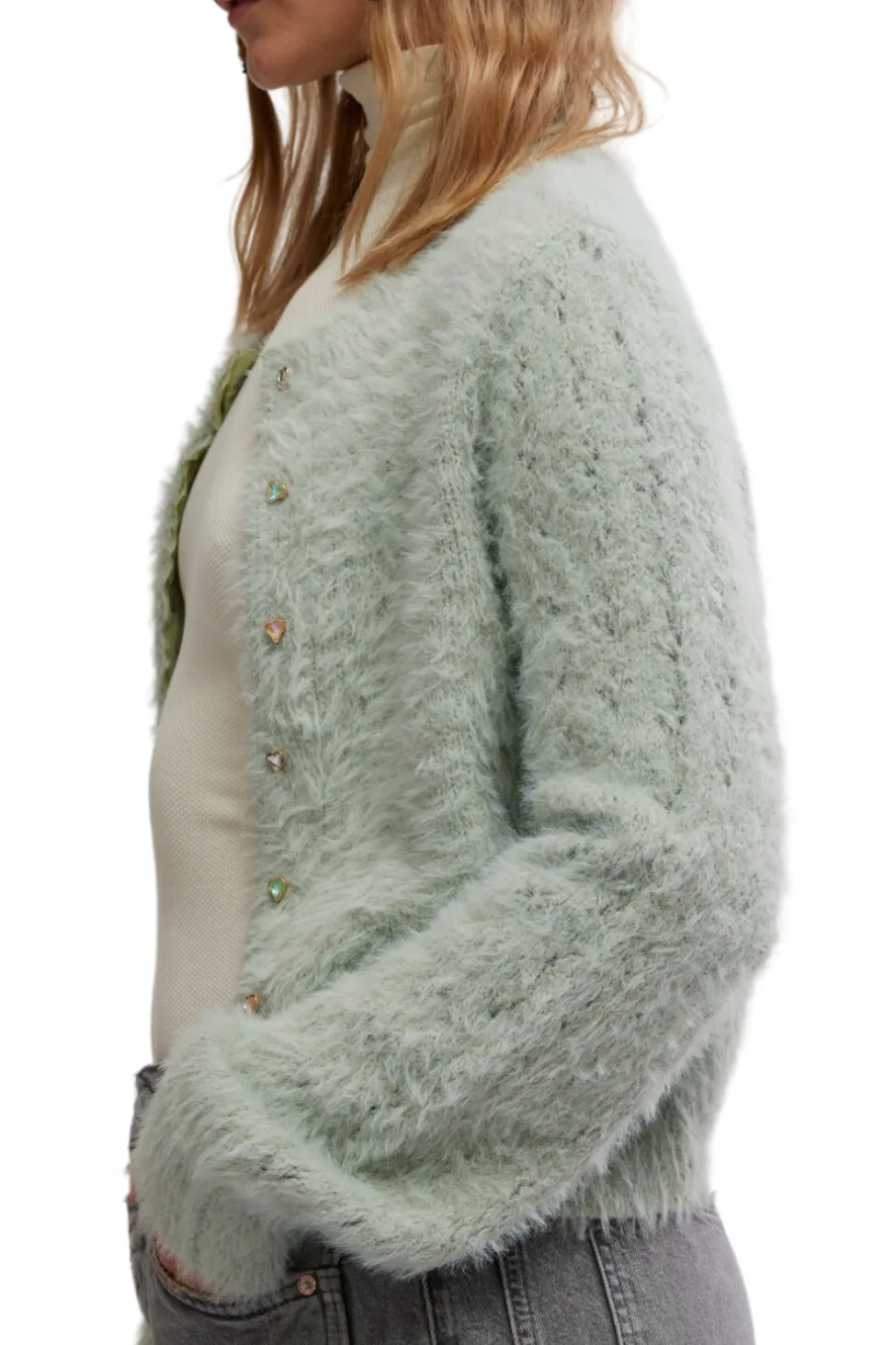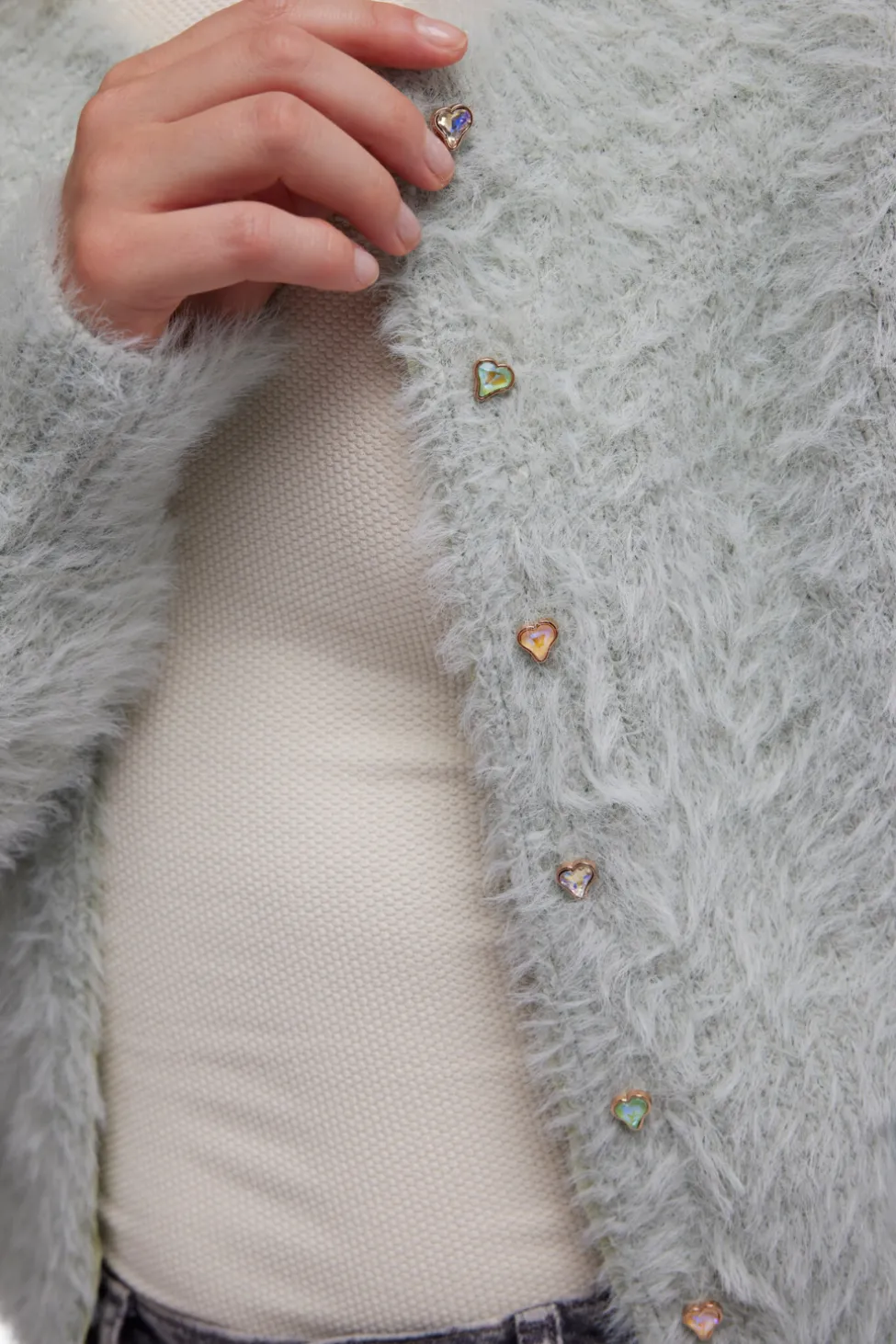 Super soft fuzzy cardigan sweater with pointelle knit detailing.