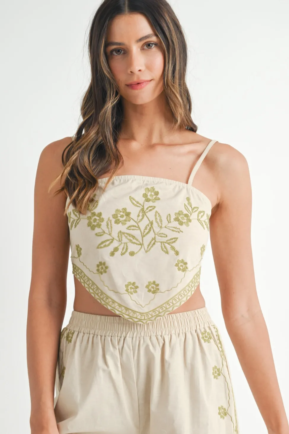 Embroidered linen scarf top.
